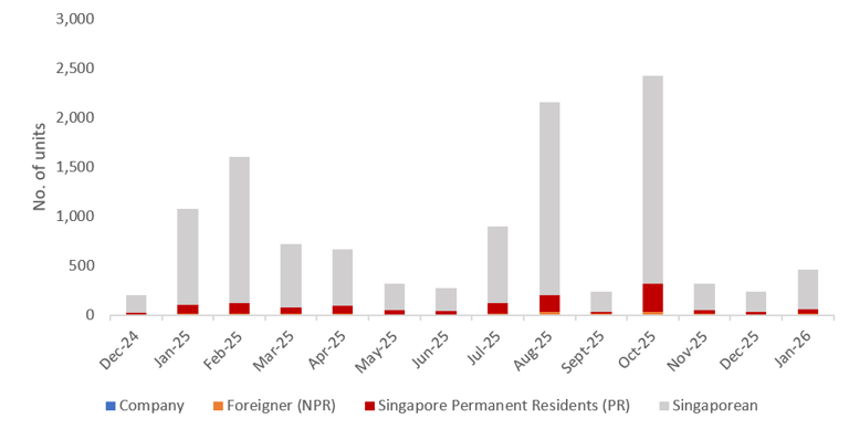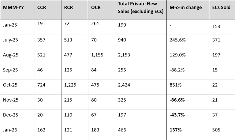 January 2026’s monthly developer sales report recorded 466 new private homes (excluding ECs), reflecting a 137% month-on-month (m-o-m) increase in transaction volume.